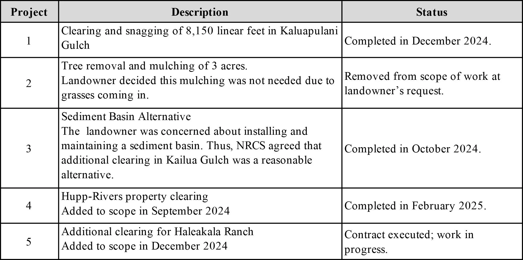 In September and October 2024, contractors commenced and completed tree removal and chipping work in Kailua Gulch on Haleakala Ranch land. The clearing project encompassed approximately 1,198 linear feet. On October 8, 2024, NRCS staff visited the site to ensure project implementation met NRCS standards and specifications.