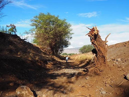 Gulches & Tree Removal: In general, the bottom of gulches within the Pulehu fire unit were not burned, and the vegetation appears to be intact. Furthermore, prior land management, particularly in the Mahi Pono section, often included piling of rocks and soil along the top edges of gulches. For these reasons, mulching as a soil stabilization measure is not considered a high priority practice in the Pulehu burn unit.